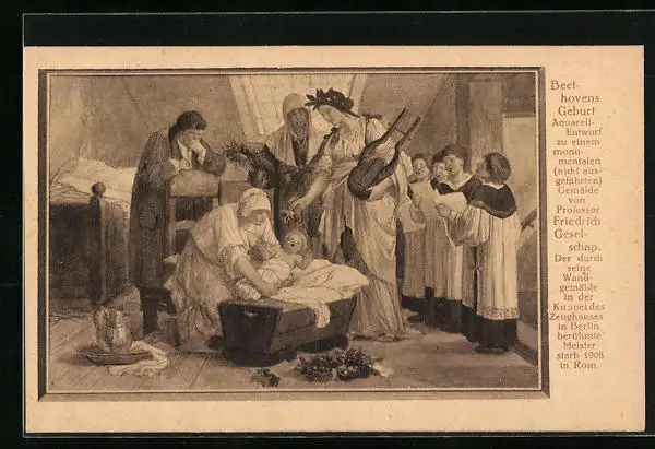 AK Frau mit Harfe an der Wiege bei Beethovens Geburt