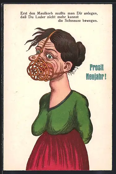 AK Frau mit Maulkorb, frauenfeindlicher Humor
