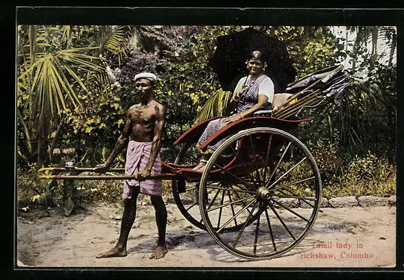 AK Frau mit Schirm lässt sich in einer Rikscha chauffieren