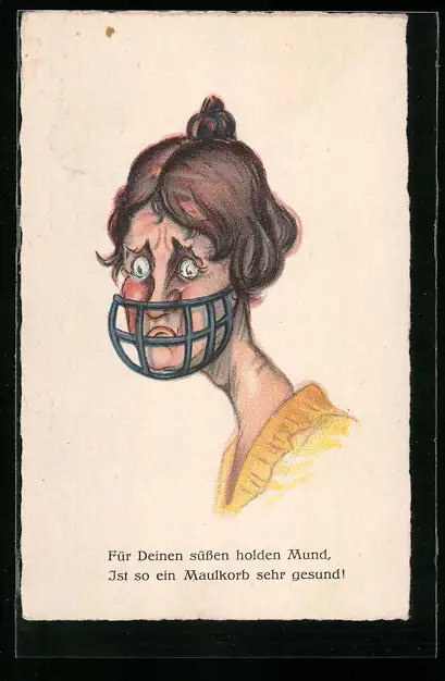 AK Frau mit einem Maulkorb, frauenfeindlicher Humor