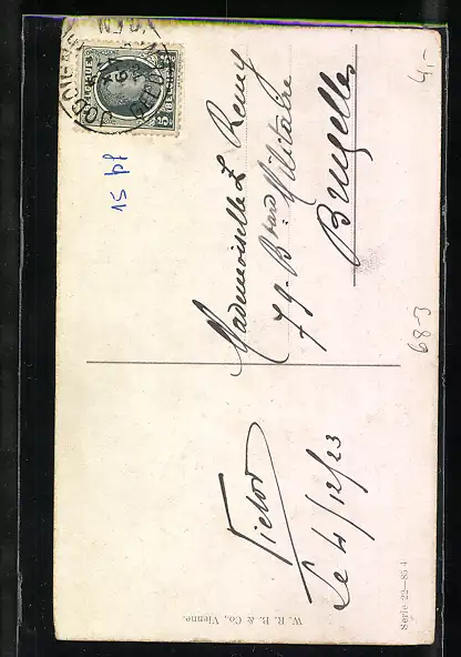 Personenbezogene Daten auf der Rückseite der Karte wurden durch blauen Textmarker unkenntlich gemacht. Die blauen Stellen sind auf die Vorderseite durchgeweicht und wirken sich negativ auf das Postkartenfoto aus