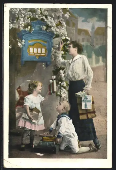 AK Frau mit zwei Kindern wirft einen Brief ein