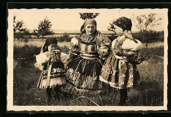 AK Frau mit zwei kleinen Mädchen in tschechischer Tracht auf einer Wiese