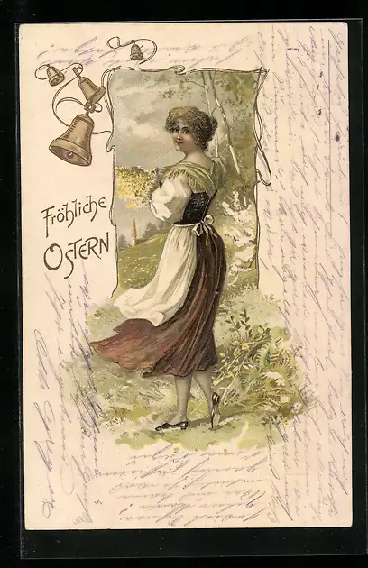 AK Frau pflückt Blumen zu Ostern