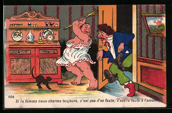 AK Frau schlägt Mann, frauenfeindlicher Humor