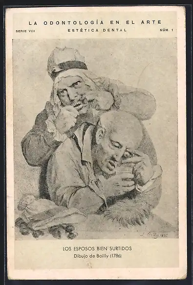 AK Frau setzt ihre dritten Zähne ein, Mann setzt sein Glasauge ein