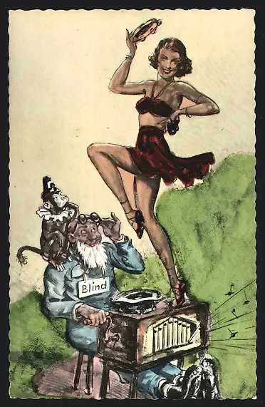 AK Frau tanzt auf dem Leierkasten eines Schein-Blinden