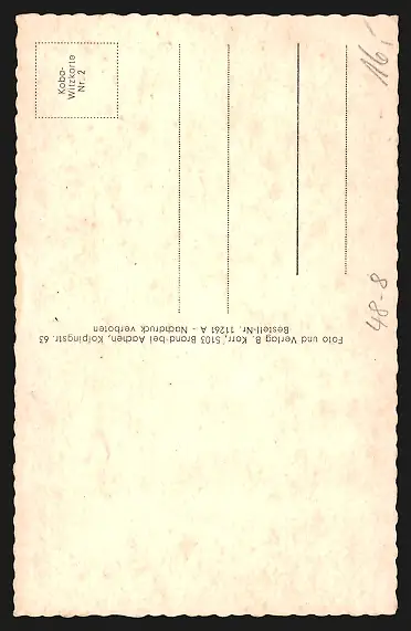 Personenbezogene Daten auf der Rückseite der Karte wurden durch blauen Textmarker unkenntlich gemacht. Die blauen Stellen sind auf die Vorderseite durchgeweicht und wirken sich negativ auf das Postkartenfoto aus