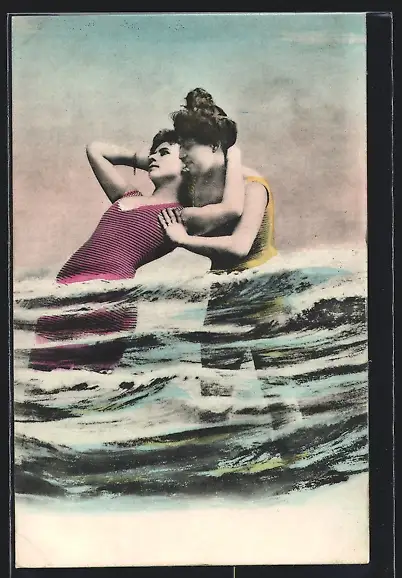AK Frauen in Badeanzügen umarmen sich in der Brandung