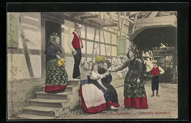 AK Frauen in elsässer Trachten vor einem Fachwerkhaus