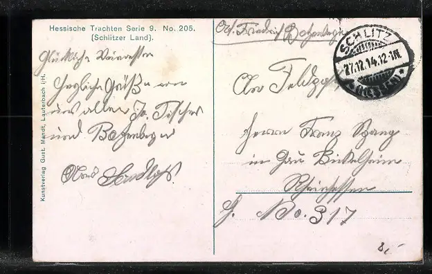 Personenbezogene Daten auf der Rückseite der Karte wurden durch blauen Textmarker unkenntlich gemacht. Die blauen Stellen sind auf die Vorderseite durchgeweicht und wirken sich negativ auf das Postkartenfoto aus
