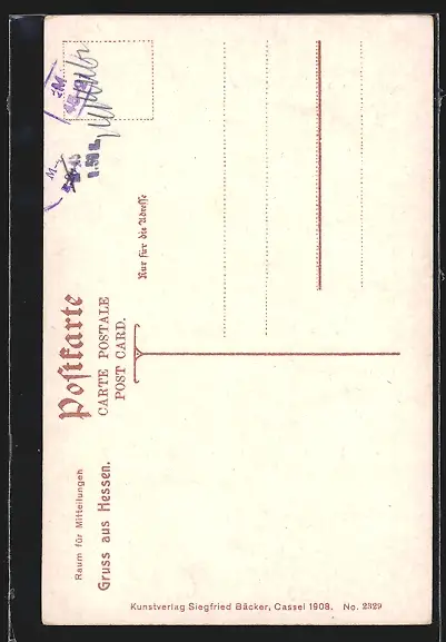 Personenbezogene Daten auf der Rückseite der Karte wurden durch blauen Textmarker unkenntlich gemacht. Die blauen Stellen sind auf die Vorderseite durchgeweicht und wirken sich negativ auf das Postkartenfoto aus