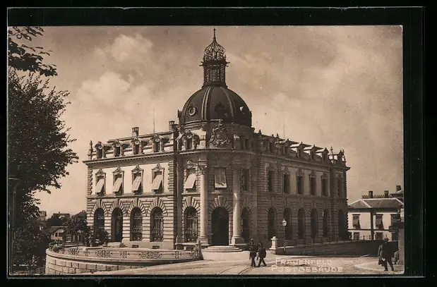 AK Frauenfeld, Postgebäude mit Soldaten auf dem Vorplatz