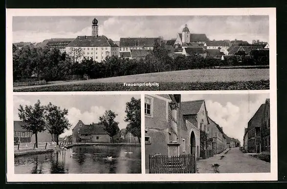 AK Frauenpriessnitz, Teilansicht, Strassenpartie mit Denkmal, Uferpartie