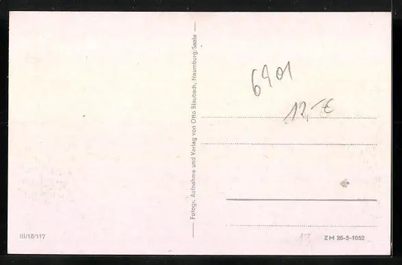 Personenbezogene Daten auf der Rückseite der Karte wurden durch blauen Textmarker unkenntlich gemacht. Die blauen Stellen sind auf die Vorderseite durchgeweicht und wirken sich negativ auf das Postkartenfoto aus