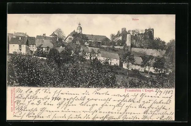 AK Frauenstein i. Erzgeb., Häuserpartie mit Ruine