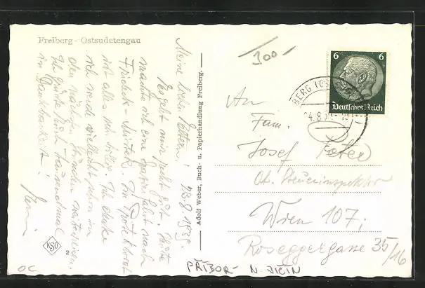 alte Ansichtskarte, gelaufen 1939, Knick in der oberen Kante, Eckknick unten rechts, guter Zustand