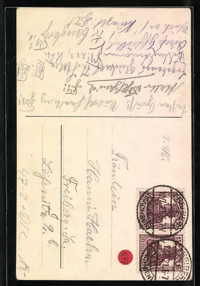Personenbezogene Daten auf der Rückseite der Karte wurden durch blauen Textmarker unkenntlich gemacht. Die blauen Stellen sind auf die Vorderseite durchgeweicht und wirken sich negativ auf das Postkartenfoto aus