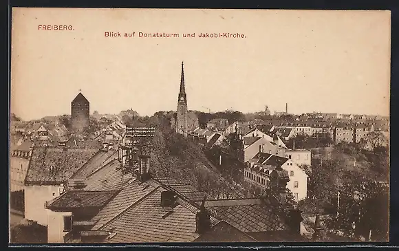 AK Freiberg / Sachsen, Teilansicht mit Donatsturm und Jakobi-Kirche
