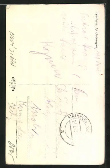 Personenbezogene Daten auf der Rückseite der Karte wurden durch blauen Textmarker unkenntlich gemacht. Die blauen Stellen sind auf die Vorderseite durchgeweicht und wirken sich negativ auf das Postkartenfoto aus