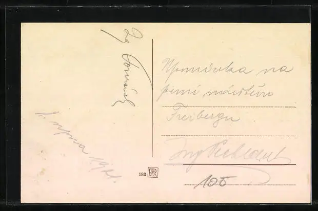 Personenbezogene Daten auf der Rückseite der Karte wurden durch blauen Textmarker unkenntlich gemacht. Die blauen Stellen sind auf die Vorderseite durchgeweicht und wirken sich negativ auf das Postkartenfoto aus