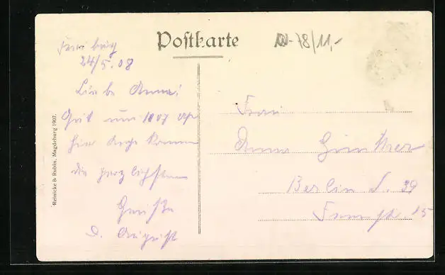 Personenbezogene Daten auf der Rückseite der Karte wurden durch blauen Textmarker unkenntlich gemacht. Die blauen Stellen sind auf die Vorderseite durchgeweicht und wirken sich negativ auf das Postkartenfoto aus