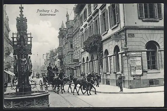 AK Freiburg / Breisgau, Kutsche am Brunnen in der Kaiserstrasse