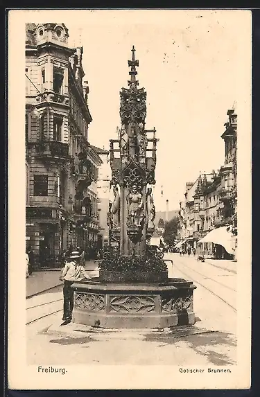 AK Freiburg / Breisgau, Mann am Gotischen Brunnen