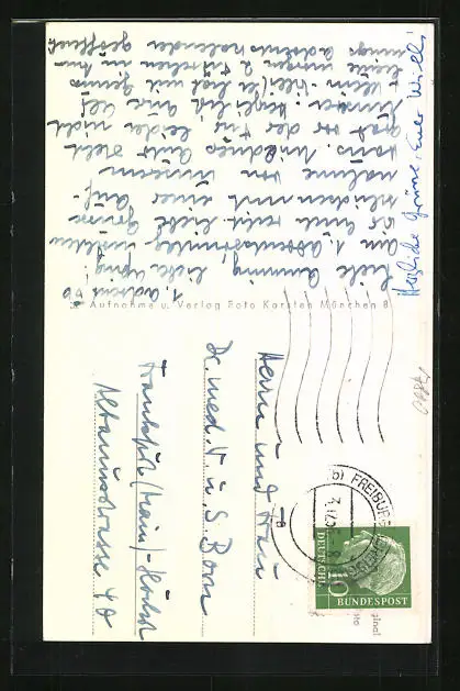 Personenbezogene Daten auf der Rückseite der Karte wurden durch blauen Textmarker unkenntlich gemacht. Die blauen Stellen sind auf die Vorderseite durchgeweicht und wirken sich negativ auf das Postkartenfoto aus