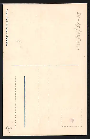 Personenbezogene Daten auf der Rückseite der Karte wurden durch blauen Textmarker unkenntlich gemacht. Die blauen Stellen sind auf die Vorderseite durchgeweicht und wirken sich negativ auf das Postkartenfoto aus