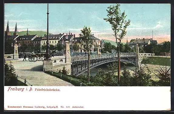 AK Freiburg i. B., Friedrichsbrücke mit Pferdefuhrwerk