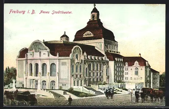 AK Freiburg i. B., Neues Stadttheater mit Pferdekutschen