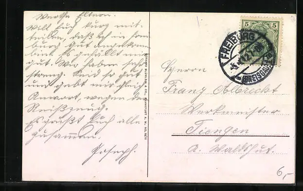Personenbezogene Daten auf der Rückseite der Karte wurden durch blauen Textmarker unkenntlich gemacht. Die blauen Stellen sind auf die Vorderseite durchgeweicht und wirken sich negativ auf das Postkartenfoto aus