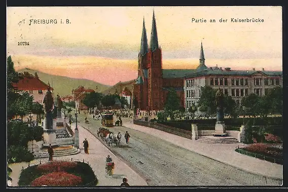 AK Freiburg i. B., Partie an der Kaiserbrücke, Strassenbahn
