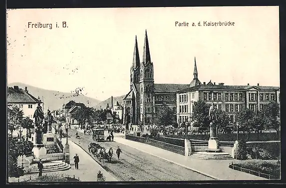 AK Freiburg i. B., Partie an der Kaiserbrücke mit Strassenbahn