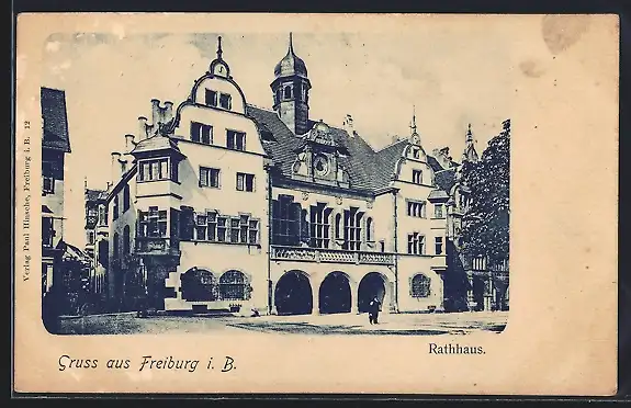 AK Freiburg i. B., Rathaus mit Strassenpartie