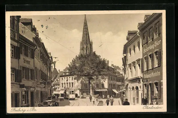 AK Freiburg i. B., Strassenbahn am Restaurant Oberlinden