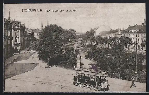 AK Freiburg i. B., Strassenbahn an der Dreisam