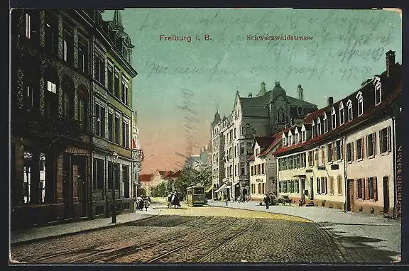 AK Freiburg i. B., Strassenbahn in der Schwarzwaldstrasse