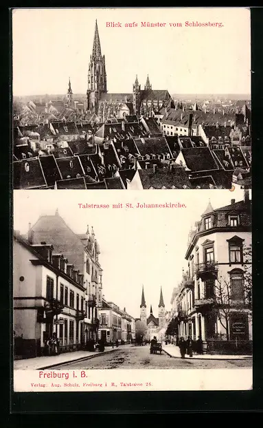 AK Freiburg i. B., Talstrasse mit St. Johanneskirche, Münster v. Schlossberg