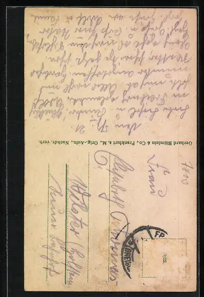 Personenbezogene Daten auf der Rückseite der Karte wurden durch blauen Textmarker unkenntlich gemacht. Die blauen Stellen sind auf die Vorderseite durchgeweicht und wirken sich negativ auf das Postkartenfoto aus