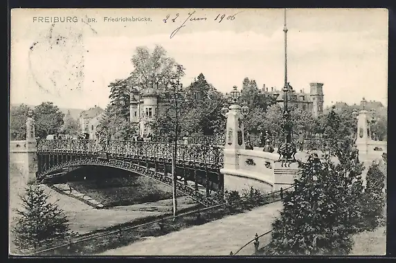 AK Freiburg i. Br., Friedrichsbrücke mit Passanten