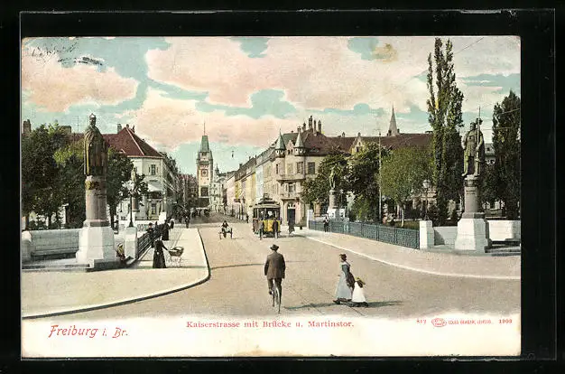 AK Freiburg i. Br., Kaiserstrasse mit Brücke u. Martinstor, Strassenbahn