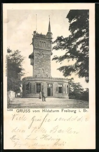 AK Freiburg i. Br., Mann vor dem Hildaturm