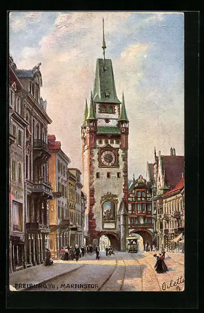 AK Freiburg i. Br., Martinstor mit Strassenbahn