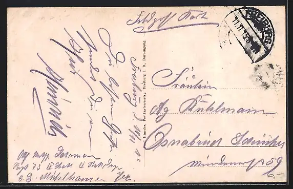Personenbezogene Daten auf der Rückseite der Karte wurden durch blauen Textmarker unkenntlich gemacht. Die blauen Stellen sind auf die Vorderseite durchgeweicht und wirken sich negativ auf das Postkartenfoto aus