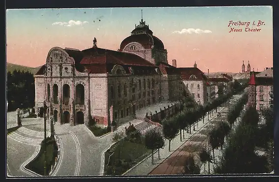 AK Freiburg i. Br., Neues Theater mit Strassenpartie
