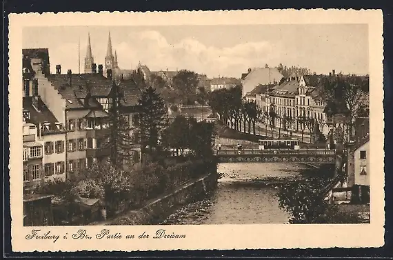 AK Freiburg i. Br., Partie an der Dreisam, mit Brücke und Strassenbahn