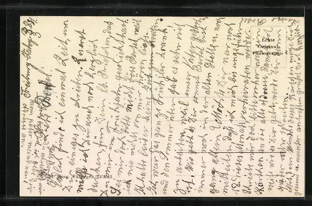 Personenbezogene Daten auf der Rückseite der Karte wurden durch blauen Textmarker unkenntlich gemacht. Die blauen Stellen sind auf die Vorderseite durchgeweicht und wirken sich negativ auf das Postkartenfoto aus