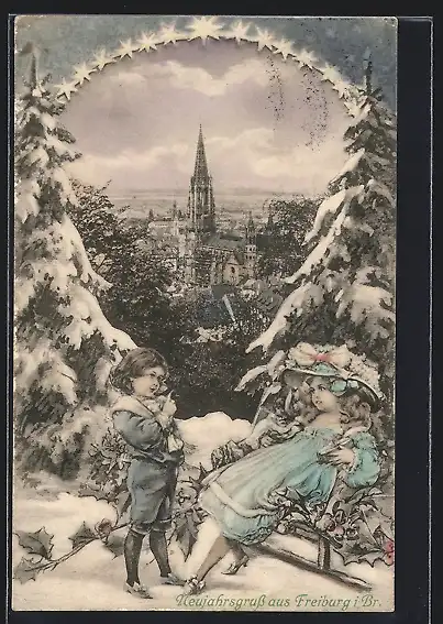 AK Freiburg i. Br., Stadtansicht im Winter-Passepartout